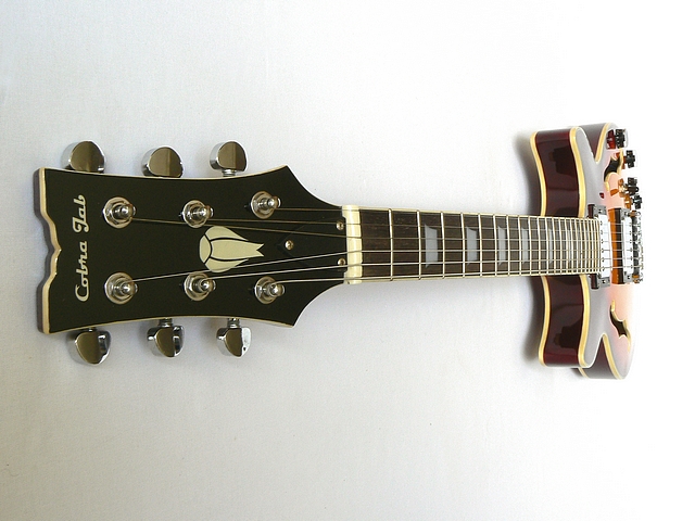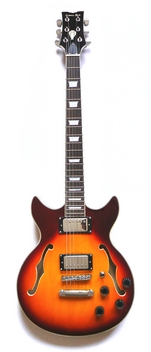 The Cobra Jab Alpha DC is a small semi hollow body guitar, with double cutaways, two F-holes, a maple set-neck and a basswood back and top. This is a great guitar with a great tone, and because of its size this guitar is really easy on your back. It comes in stunning Tobacco Sunburst finish, Abalone trapezoid inlays and chrome hardware. |